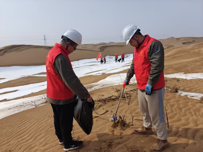 活动当天,志愿者们身着统一服装,携带垃圾袋、钳铗等工具,对光伏项目周边沙漠区域的塑料瓶、废弃包装、枯枝杂物等进行地毯式清理。